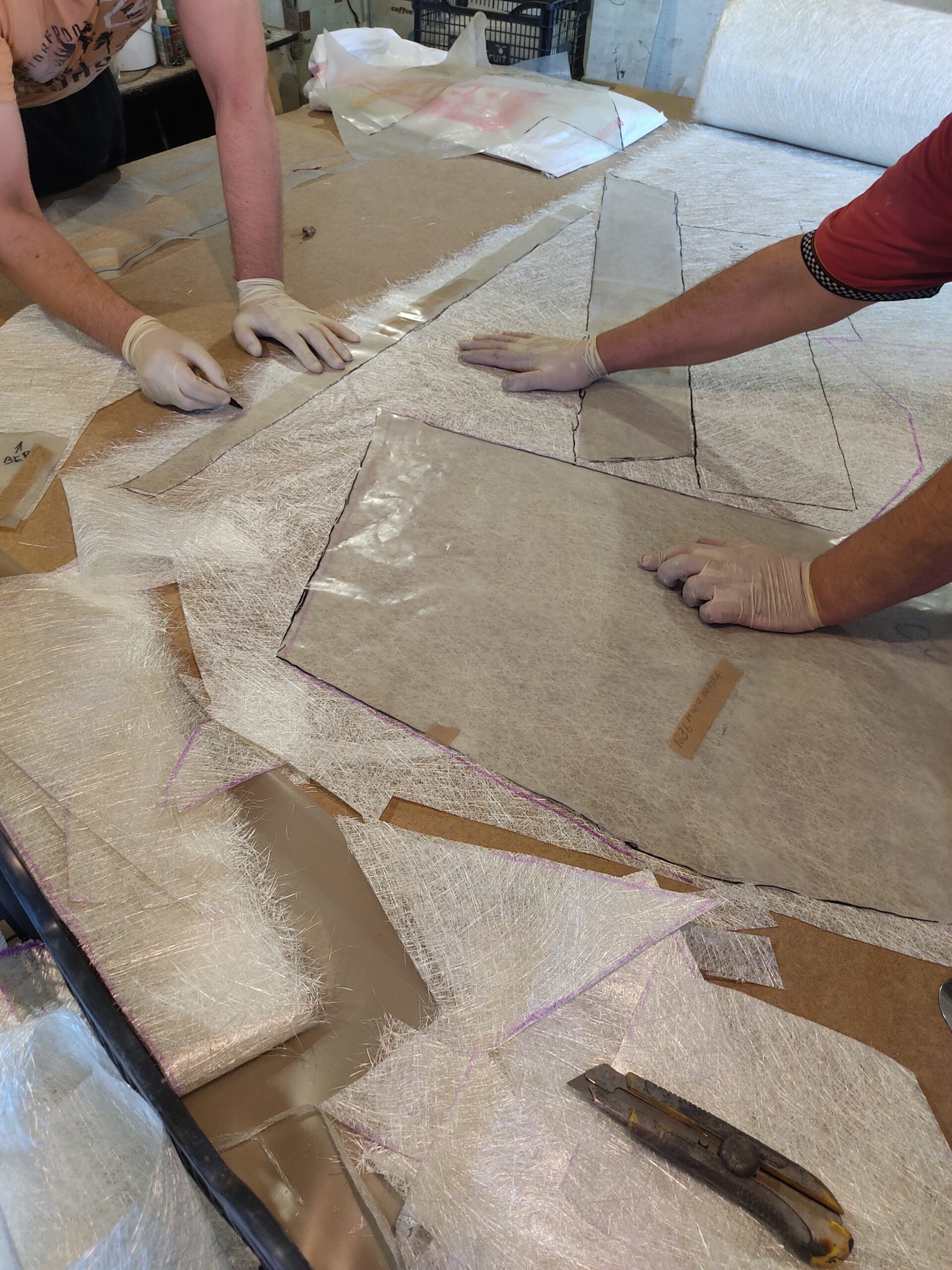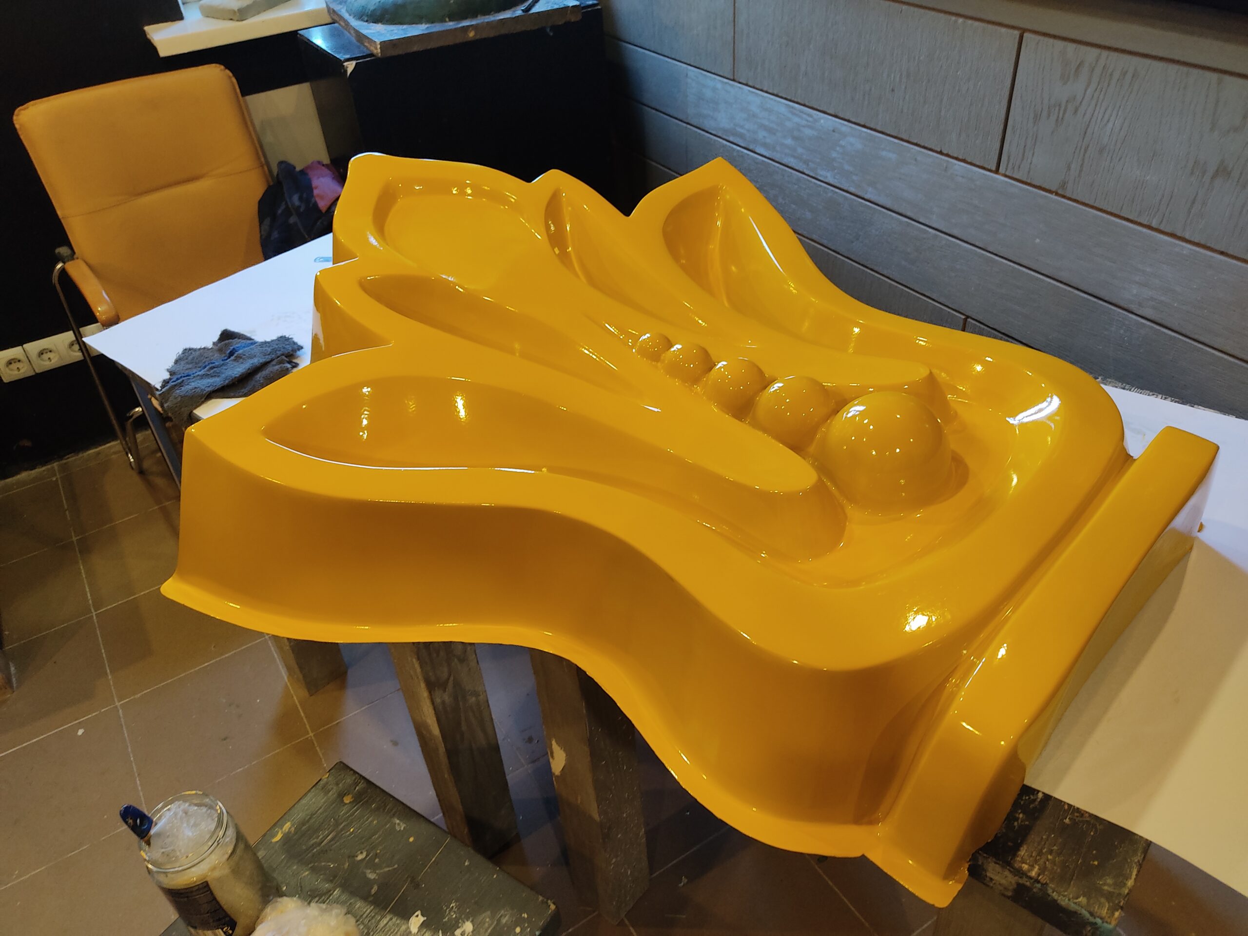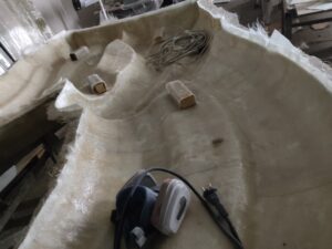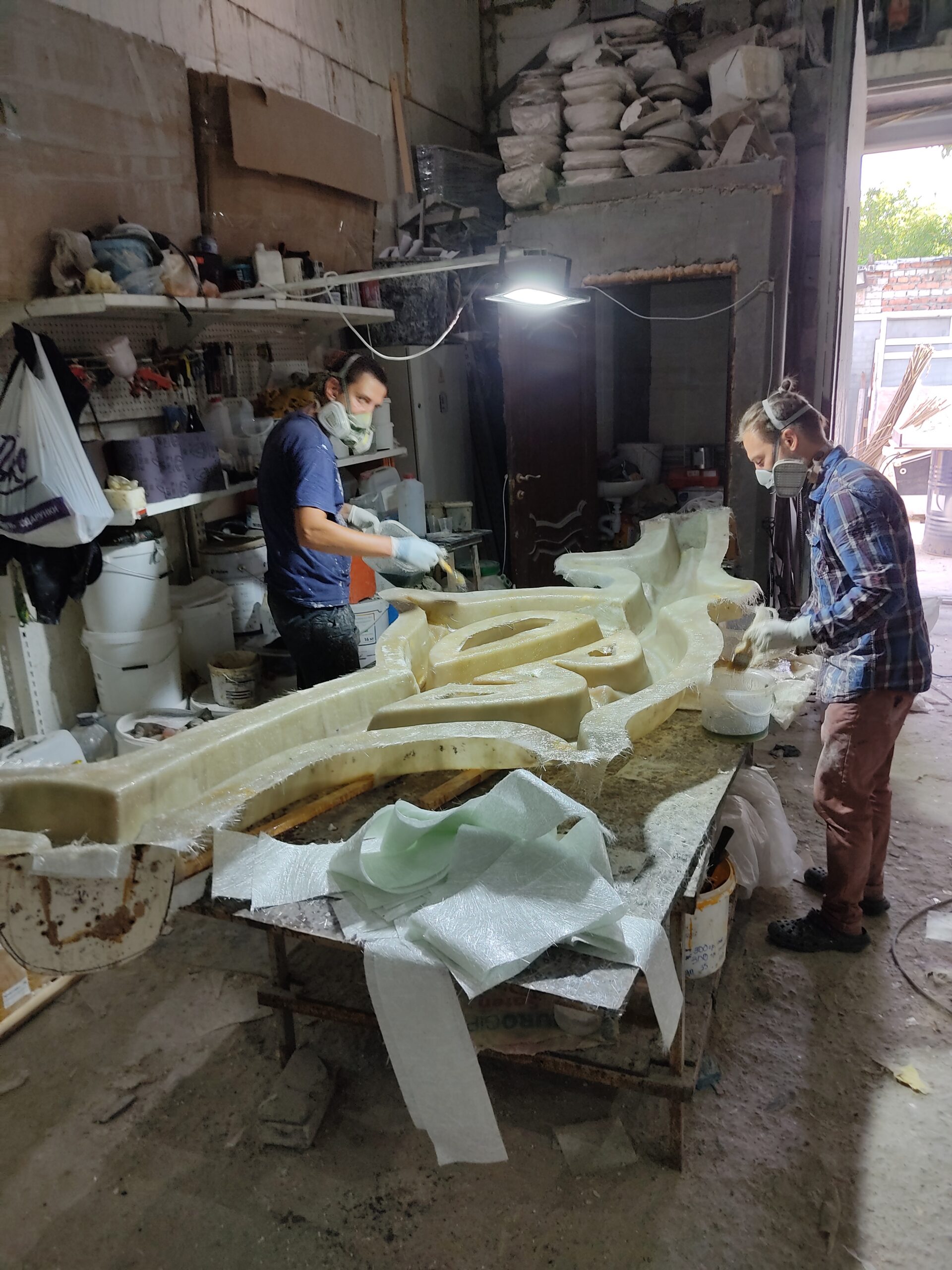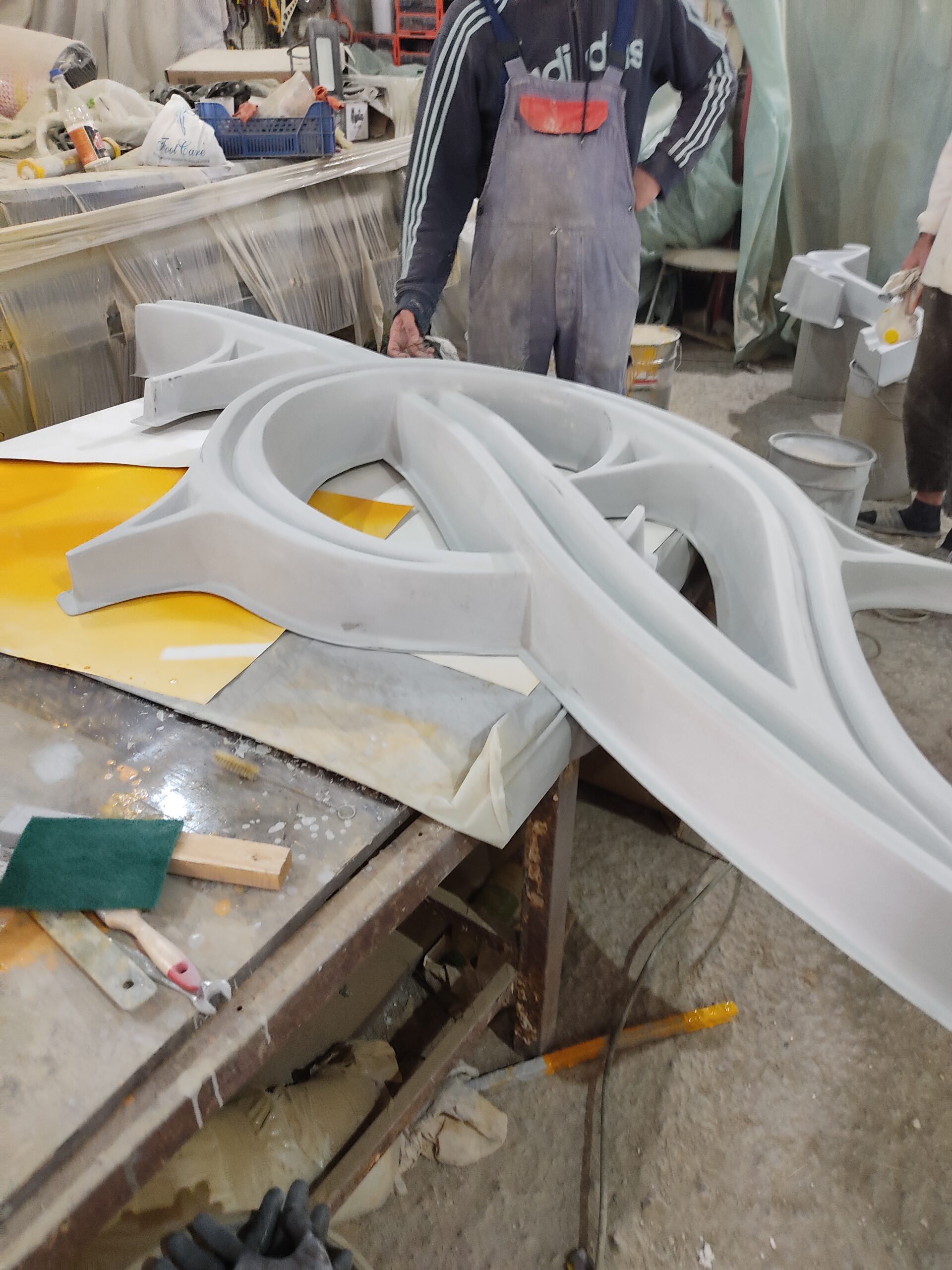 Нарощування товщини: Після гелькоуту накладаються шари скломату та смоли. Для великих форм створюється додатковий металевий або дерев’яний каркас, щоб матриця не деформувалася під час роботи.