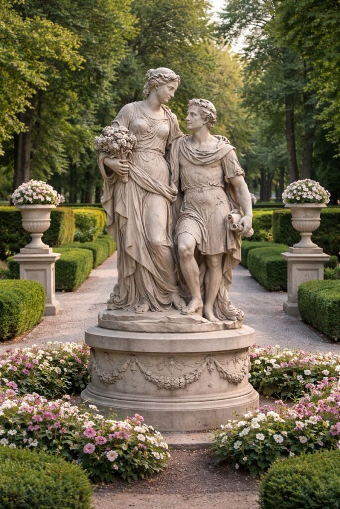 Садово-паркова скульптура з каменю відіграє ключову роль у формуванні простору. Вона створює фокусні точки, розділяє зони чи підкреслює алеї. У регулярних парках (як у французькому стилі) скульптури розміщують симетрично, тоді як у пейзажних — інтегрують природно, ніби вони виросли з землі. Камінь додає текстури, контрастуючи з зеленню, і може символізувати теми: від міфології до екології. У сучасному дизайні абстрактні форми з каменю стимулюють уяву, роблячи парк інтерактивним.